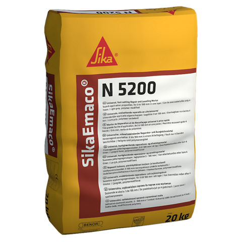 SikaEmaco® N 5200 is een universele 1-component, polymeerverbeterde en snelzettende reparatie-, herprofilerings- en nivelleringsmortel. SikaEmaco® N 5200 voldoet aan EN 1504 deel 3 van de klasse R2 mortel. SikaEmaco® N 5200 is een gebruiksklaar product op basis van geselecteerde sulfaatresistente cementen (HSR LA), hydraulische bindmiddelen en hoogwaardige kwartszanden met specifieke korrelopbouw. Gemodificeerd met zorgvuldig geselecteerde polymeren en versterkt met vezels (polyacrylonitril) werkt SikaEmaco® N 5200 krimpcompenserend, vermindert scheurvorming en worden de fysieke eigenschappen en specifieke kenmerken aanzienlijk verbeterd. Indien SikaEmaco® N 5200 met water wordt gemengd vormt het een mortel met een uitzonderlijk brede waaier van toepassingsmogelijkheden. SikaEmaco® N 5200 kan gemakkelijk in een laagdikte van 3 tot 100 mm met de hand of met een spaan worden aangebracht, in 1 applicatie.