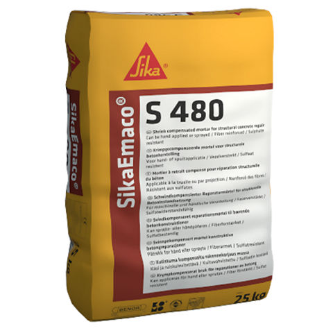 SikaEmaco® S 480 is een 1-component gebruiksklaar product dat met water moet gemengd worden teneinde een thixotrope mortel te verkrijgen. Het is gemaakt met hydraulische bindmiddelen en sulfaatbestendige Portland cement (HSR LA). SikaEmaco® S 480 - versterkt met PAN (polyacrylonitril) vezels - is krimpcompenserend, waterdicht en is bijzonder duurzaam zelfs in agressieve omgevingen. Het heeft een sterke hechting aan staal en is chloridevrij. Het gedrag van SikaEmaco® S 480 m.b.t. brand voldoet aan DIN 4102 deel I (05/98) Bauprodukte der Baustoffklasse A1. SikaEmaco® S 480 is chroomarm (Cr-VI) < 2 ppm. Het product wordt aanbevolen voor herstellingen tot 40 mm dikte per laag. SikaEmaco® S 480 wordt aanbevolen voor toepassingen met de troffel of spuitmachine. Cementmortels dienen steeds nabehandeld te worden met water of met een aangepaste curing compound om verdamping te vermijden. Zelfs zonder deze bescherming vertoont SikaEmaco® S 480 geen scheuren wat wel kan voorkomen bij mortels die de eerste 24 uren niet behoorlijk beschermd en nabehandeld worden.