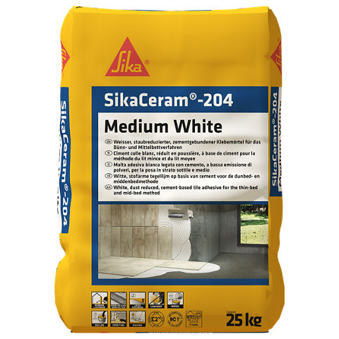 SikaCeram®-204 Medium White is een witte, stofgereduceerde cementgebaseerde mortellijm met verbeterde hechting, voor middelgrote keramische tegels. Hij kan worden gebruikt in lagen tot 10 mm dik en is geschikt voor het betegelen van vloeren en muren van residentiële gebouwen, zowel binnen als buiten. SikaCeram®-204 Medium White is C2 TE geclassificeerd volgens EN 12004