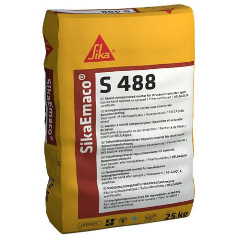 SikaEmaco® S 488 is een 1-component, krimpgekompenseerde structurele reparatiemortel met hoge sterktes en hoge elasticiteitsmodulus die voldoet aan de voorwaarden van EN 1504-3 klasse R4. SikaEmaco® S 488 wordt met water gemengd om een thioxotrope mortel te verkrijgen die gemakkelijk kan worden aangebracht met de troffel of spuitmachine.