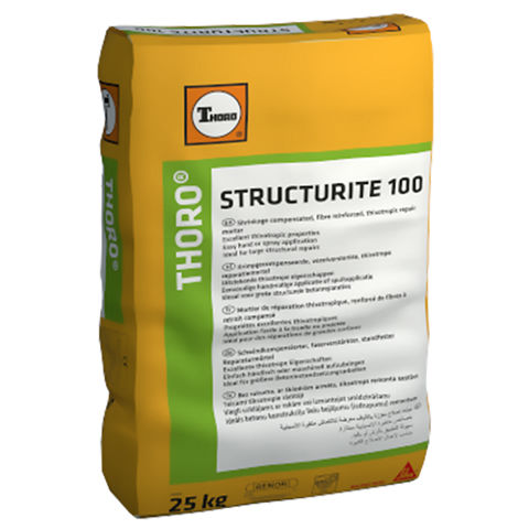 THORO STRUCTURITE 100 is samengesteld uit sulfaatbestendige Portland cement, geselecteerde silica en polyacrylonitrilvezels. Aangemaakt met water vormt THORO STRUCTURITE 100 een krimpgecompenseerde reparatiemortel voor handmatige of spuitapplicatie. THORO STRUCTURITE 100 voldoet aan de klasse R4, aanbeveling voor mortels, volgens EN 1504-3.