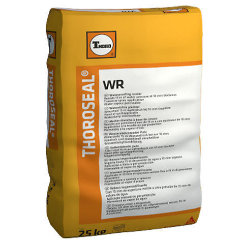 THOROSEAL WR Grijs bevat sulfaatresistente Portland cement, terwijl THOROSEAL WR Wit op basis is van witte Portland cement. Beide versies (Grijs en Wit) bevatten geselecteerde silica, plastificeerders en modificeermiddelen. Aangemaakt met water vormt THOROSEAL WR een cementgebaseerde waterdichte pleister.